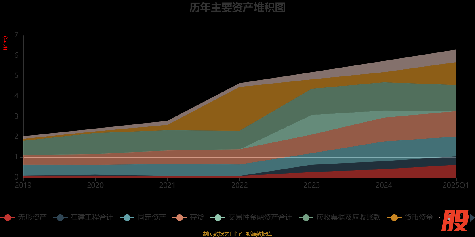 资产重大变化方面,截至2025年一季度末,公司货币资金较上年末增加125.35%,占公司总资产比重上升9.13个百分点;交易性金融资产合计较上年末减少100%,占公司总资产比重下降6.09个百分点;应收票据及应收账款较上年末减少7.53%,占公司总资产比重下降3.81个百分点;无形资产较上年末增加50.78%,占公司总资产比重上升2.74个百分点。