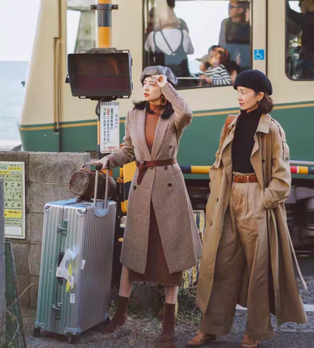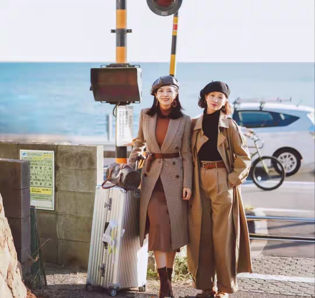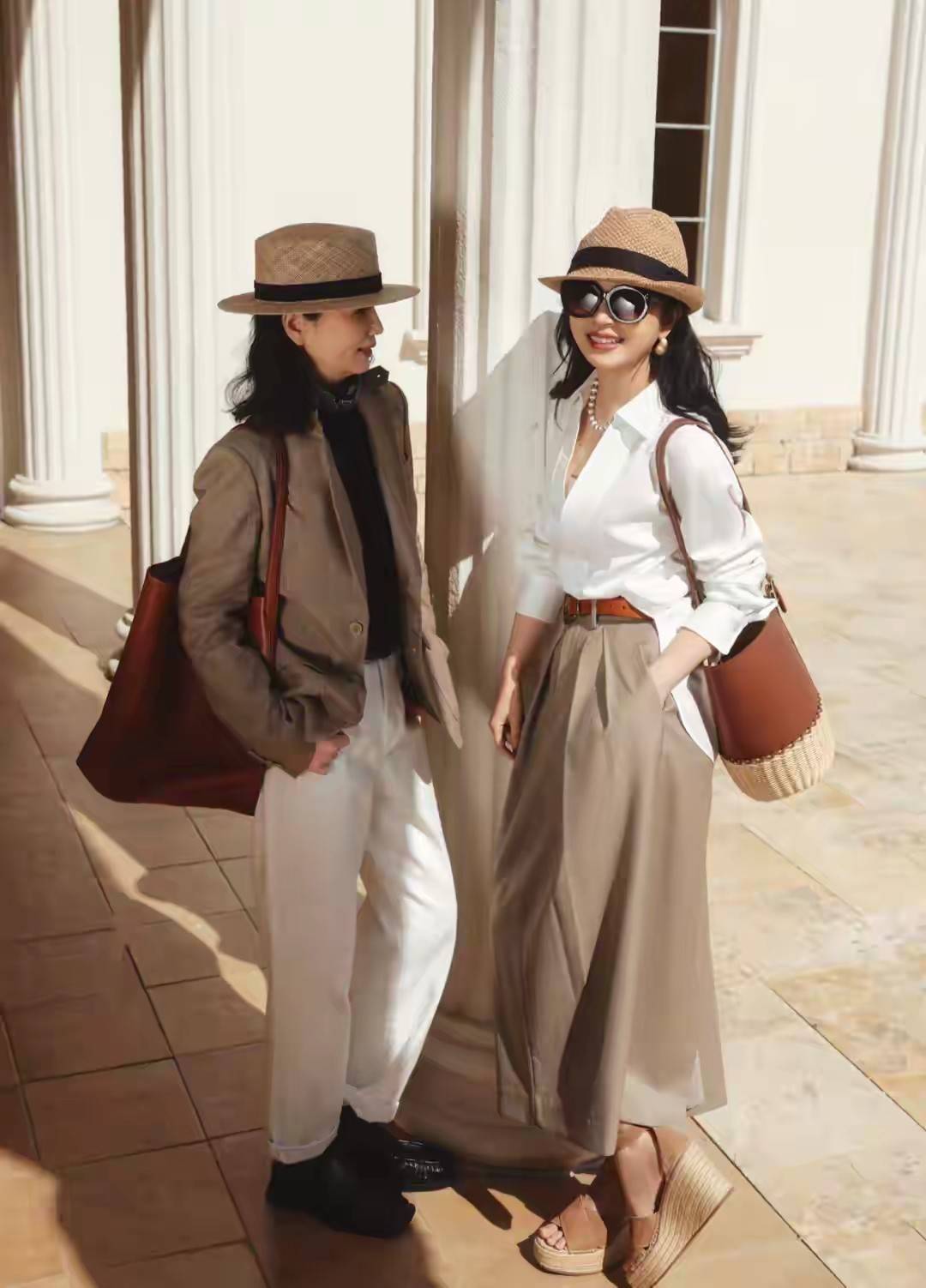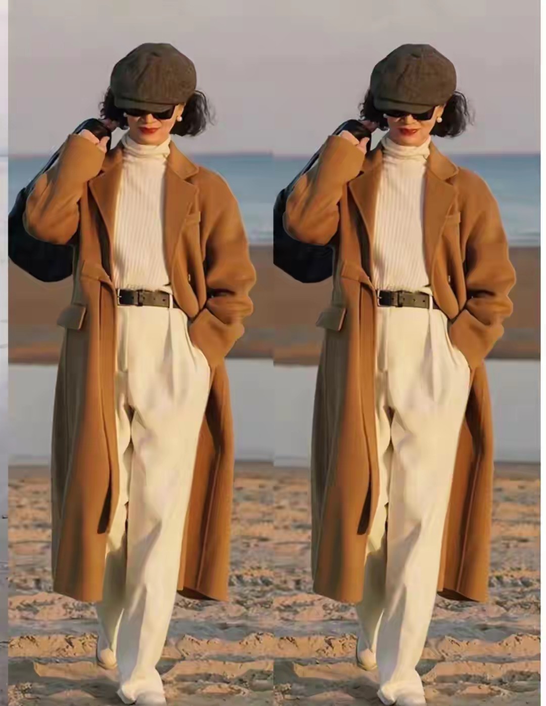 简单的穿搭,反而能让你变得更高贵,例如用一件比较有质感,有垂坠感的驼色大衣外套,内搭半高领的白色针织上衣和一条白色的西装,裤脚上穿的一双白色的皮鞋,出门旅游拍照绝对出片,而且气场全开。