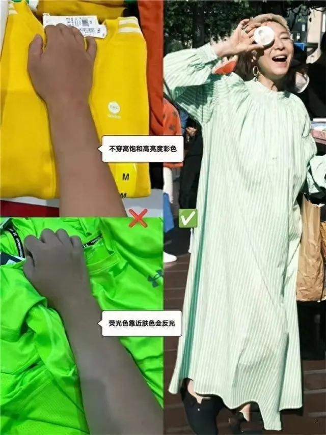 色彩也不能过于鲜艳,例如下面这种高饱和高亮度彩色的黄色针织上衣,或者是荧光色的衣服单品,穿在身上之后,反而会显得你的皮肤显黑,如果你真喜欢彩色系的衣服,可以直接选择右边的这一件浅色系的条纹连衣裙来穿搭,反而会更简约大气。