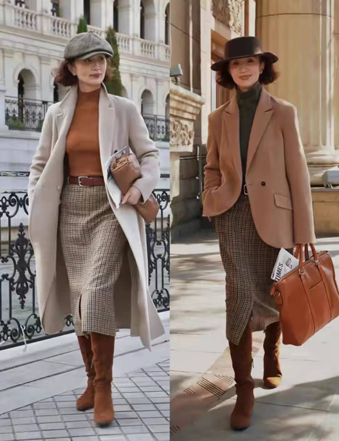 就算是六七十岁的中年女性,也是可以选择用大衣外套来搭配上裙子的,比如下面用一件米白色的大衣内搭驼色的针织上衣和格纹的直筒半身裙,脚上穿了一双驼色的中筒靴,这样的穿衣打扮显得很有气质,而且显得年轻十岁都不止。