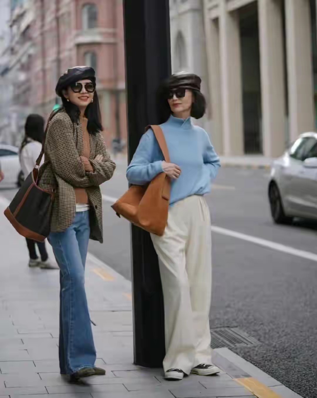 腿型不是很好,这时候应该学习右边的这位素人博主,直接用一条雾霾蓝的西装阔腿裤来穿搭,可以把腿部的缺陷给遮住,再加上一款小宽松的蓝色针织上衣,能够使得穿搭者体态优雅,挺拔气质也显得高级。