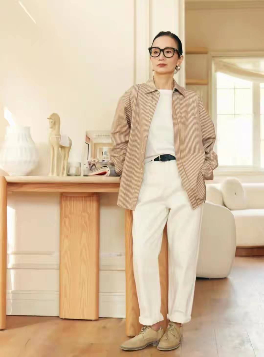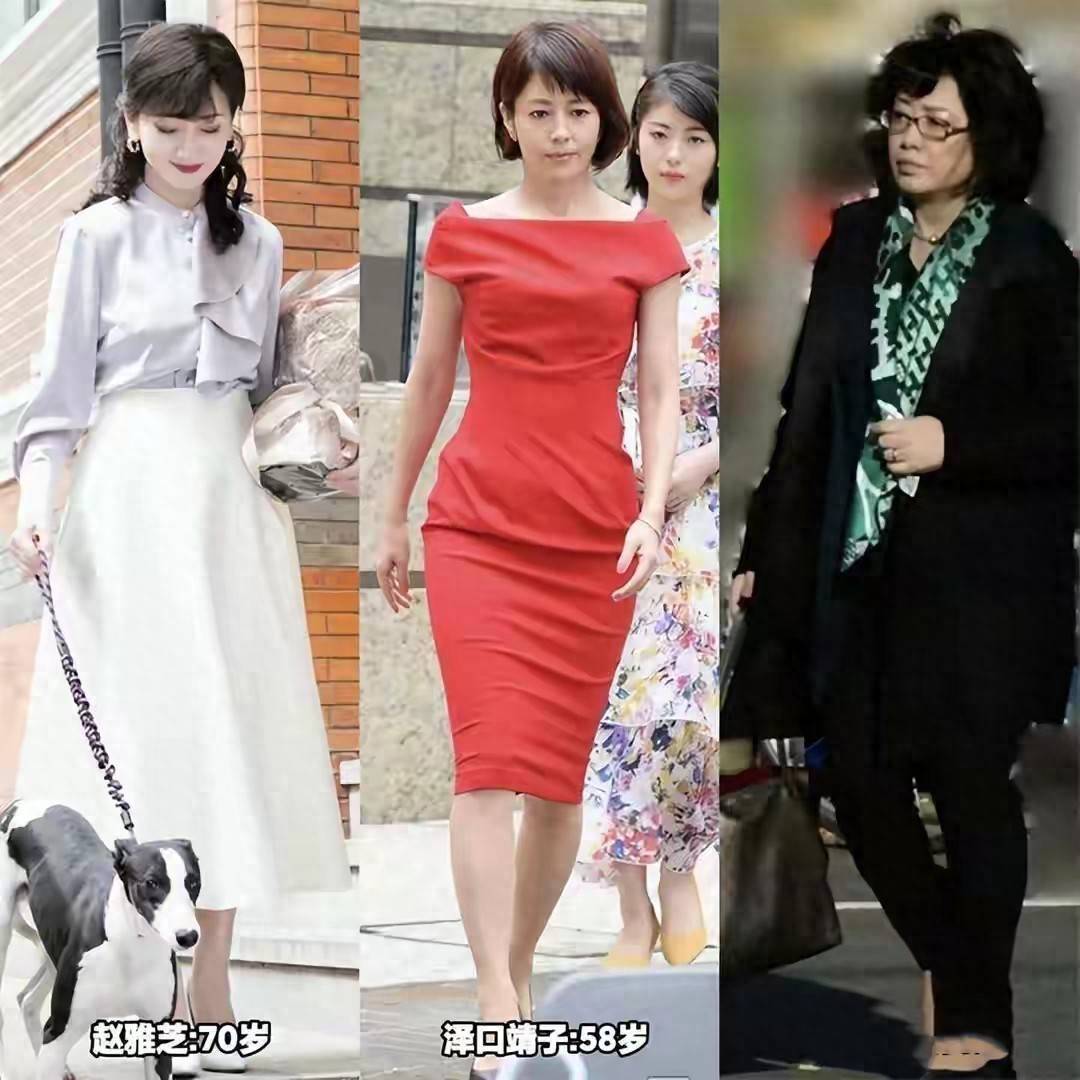 咱们就看下面3套穿,都是已经中年的阶段,但是三个人的气质有着天壤之别。赵雅芝的年龄已经70岁了,但选择了一件比较有质感的衬衫,搭配上白色的a字半身裙,呈现出来的效果优雅大方,显得年轻,但是另外两位就没法穿出这样的高贵感了。