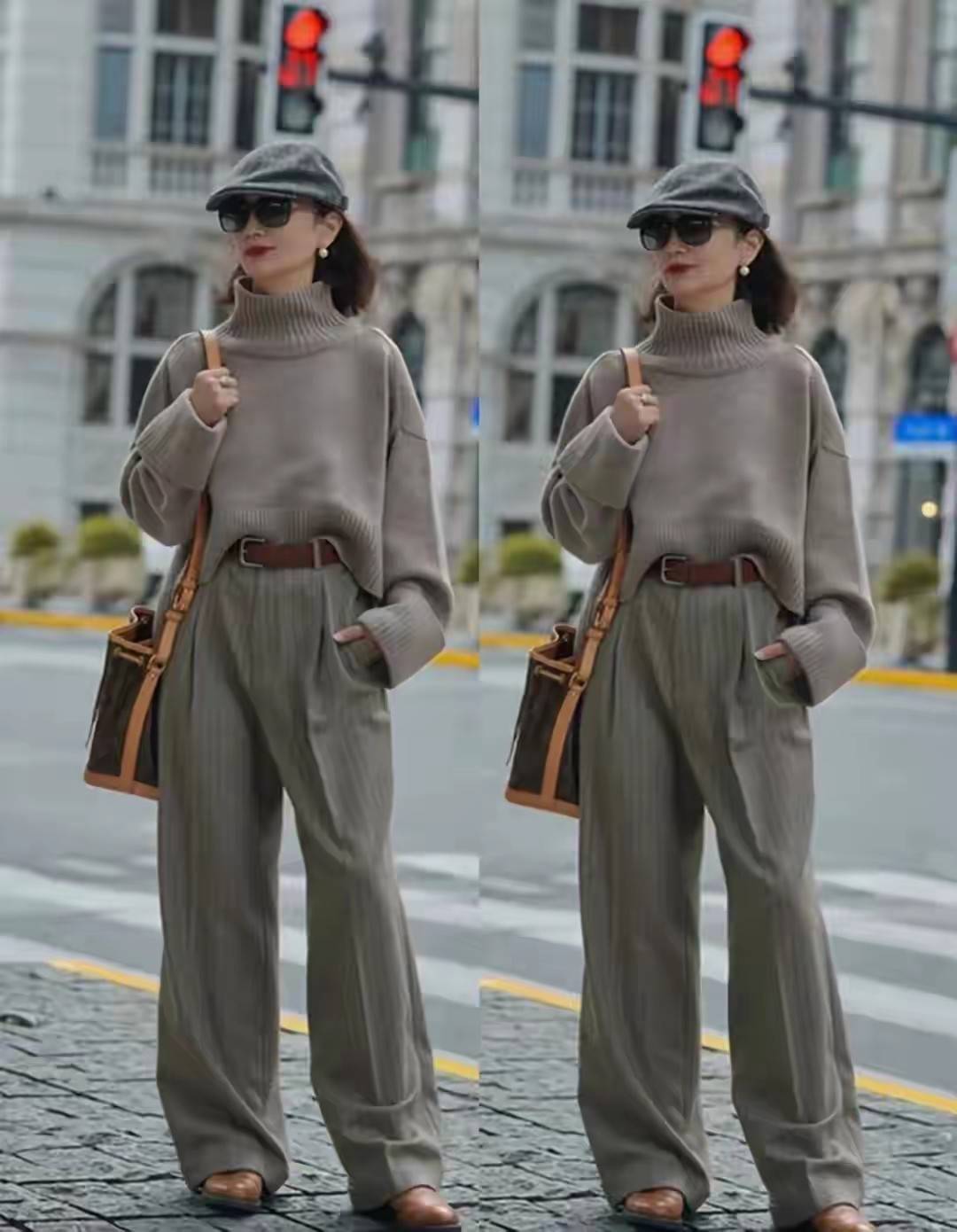 或者用一款驼色的皮鞋搭配灰色的西装裤,加上宽松款的半高领针织上衣,这一身打扮简约干练。