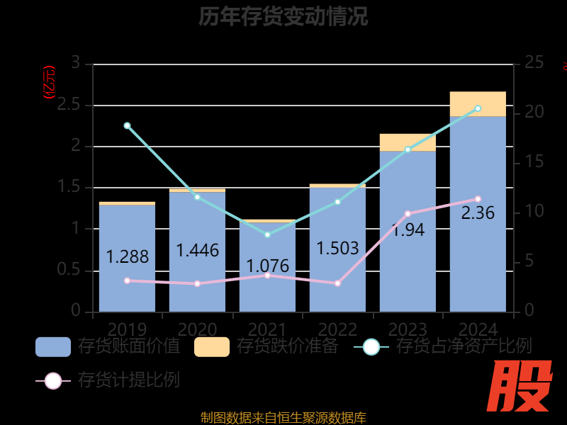 从存货变动来看,截至2024年末,公司存货账面价值为2.36亿元,占净资产的20.49%,较上年末增加4202.28万元。其中,存货跌价准备为3025.55万元,计提比例为11.36%。